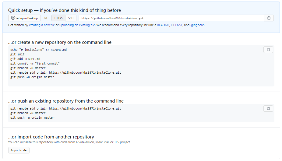 - git remote add origin https://github.com/kbs8971/instaClone.git 콘솔에서 명령어 실행